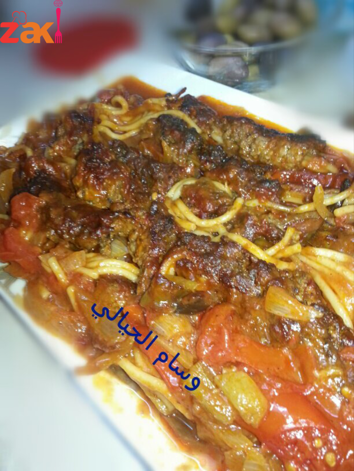 وخليب بلصينيه البصل والطماطه والفلفل الاخضر وصفيت الاسباكيتي فوقهم وخليت طبقه ثانيه فوق الاسباكيتي من البصل والطماطه والفلفل وصفيت الاسباكيتي يعني صار عندي طبقتين من الكباب سباكيتي وبوسطهم الخضراوات