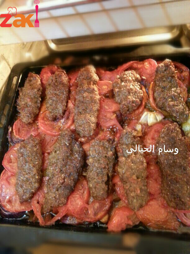 بعدين صفيت بصينيه بصل وطماطه حلقات مثل ماموجود بالصوره وخليت الصينيه تقريبآ قريبه من اسفل الاوفن(فرن)وبعدين شيشت الكباب واحاول اسحب قطعة الكباب بهدوء حتى لايتفلش شكلهاوطبعآ من اشييش الكباب ابلل ايدي بشوية ماي ومعجون. وبعدين صفيت القطع عالمشبك مال الاوفن مثل ماموضح بالصوره.