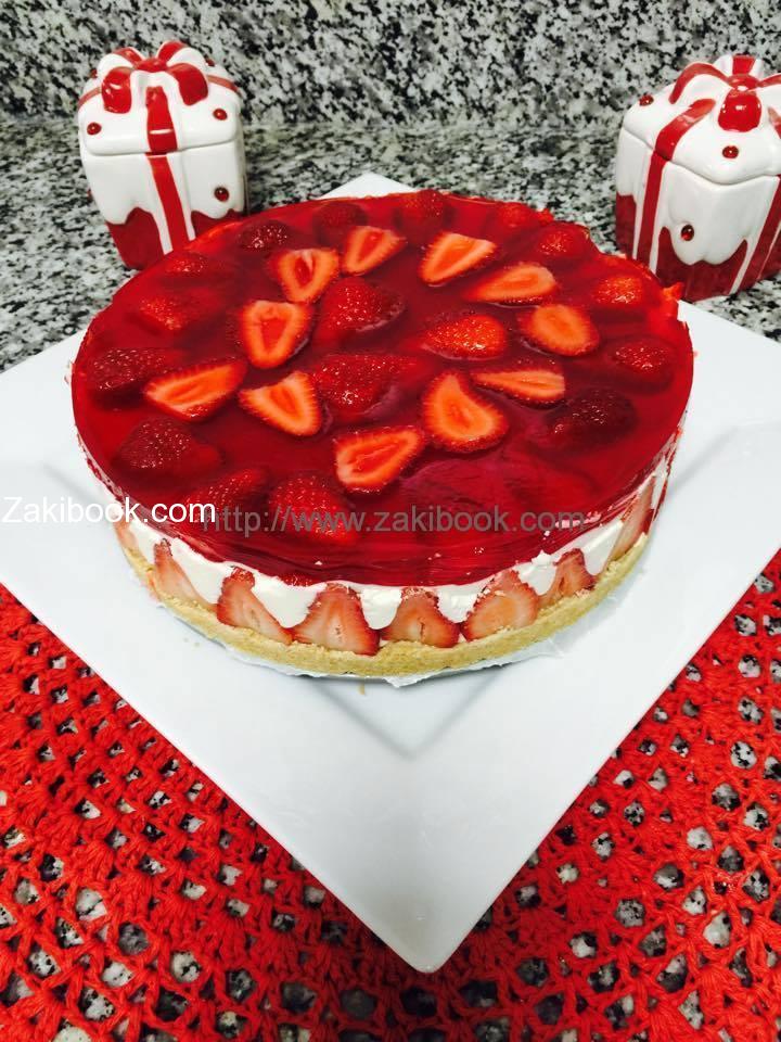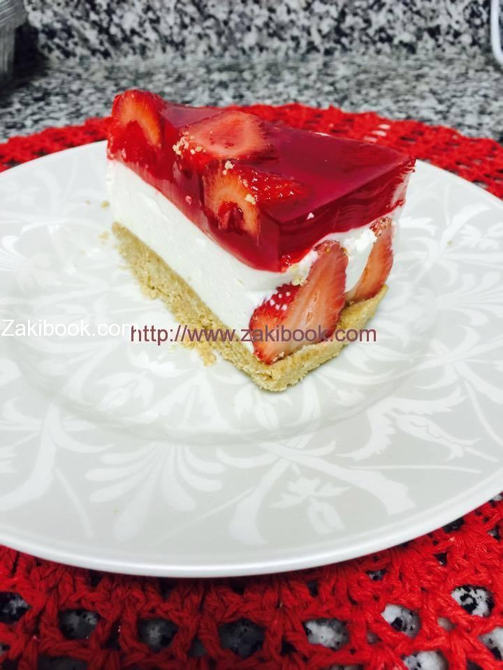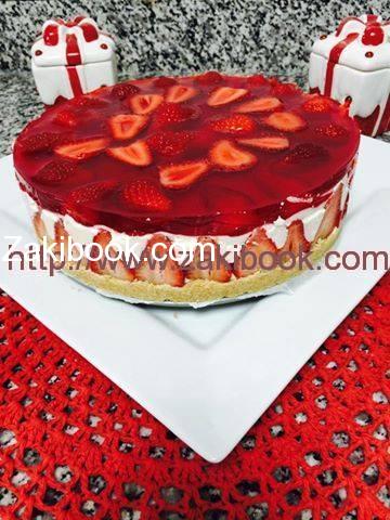 – وبنجيب القالب اللي فيه البسكوت وبنرص على حوافه للقالب الفراولة اللي قطعناها من النص وبنزل الخليط فوق البسكوت وبنرجع بندخله على التلاجه لبين ما تجمد الطبقه منيح كتير وبعدها بندوب باكيتين جلي فراولة وبتركه شوي يفتر لازم ما يكون سخن كتير وبقطع قطع فراولة بحطها فوق وبصب فوقها الجيلي وبنرجعها على التلاجه مره تانيه عشان تجمد, وصحة وألف عافية.