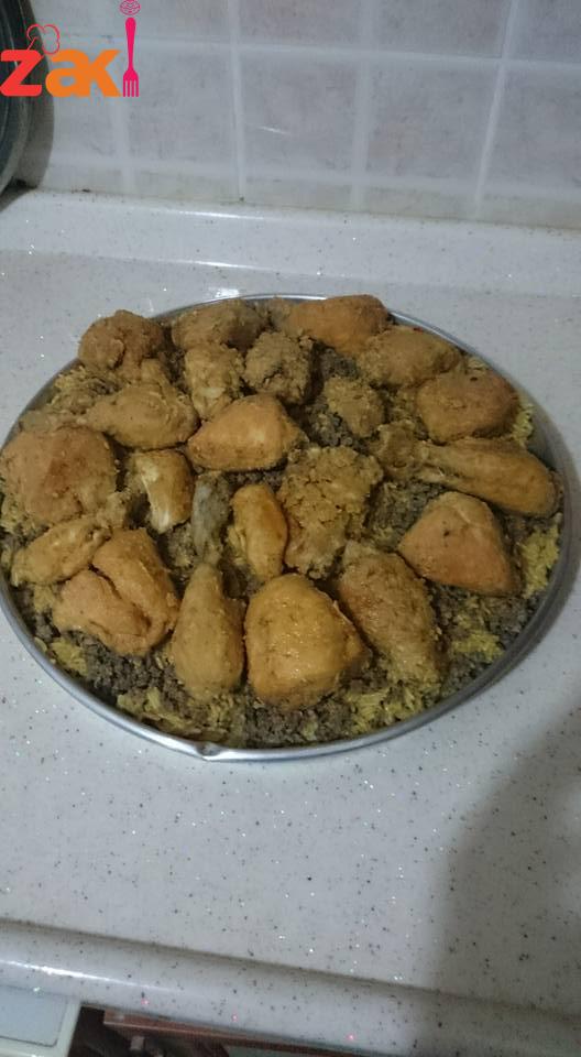 للتزيين لحمة ناعمة عوجه الكبسة. بعد نضوج الفراريج نغمسه بالبيض ثم بالكعك المطحون ناعم ويتم القلي في زيت حامي ثم نضعه ع وجه الكبسة وصحة ومية هنا وأسفة للاطالة….