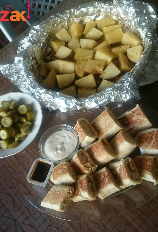 بس يبرد ادهن الخبز مايونيز و حط كمية من الدجاج و البطاطا المقلية و لفها و ع grill حمصها و قطعها و بجنبها مخلل و بيبسي و سلطة و صحتين