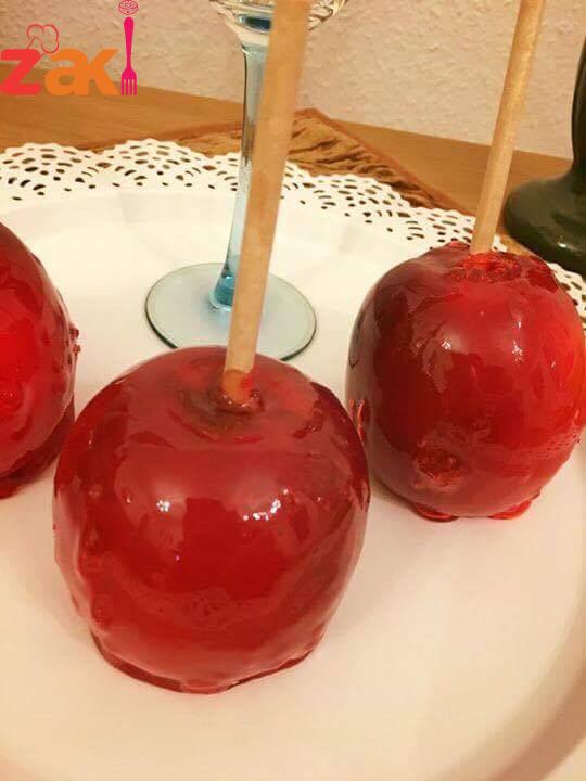 نشيله عن النار نضع الملون الاحمر نحرك ، نغطس التفاحات تقريبا غطسه واحده حتى لاتتكون لدينا طبقه سميكه وتكون خفيفه وقت الاكل ، يفضل وضعها على ورق زبده المستخدم للفرن حتى تجف ولا تلتزق.