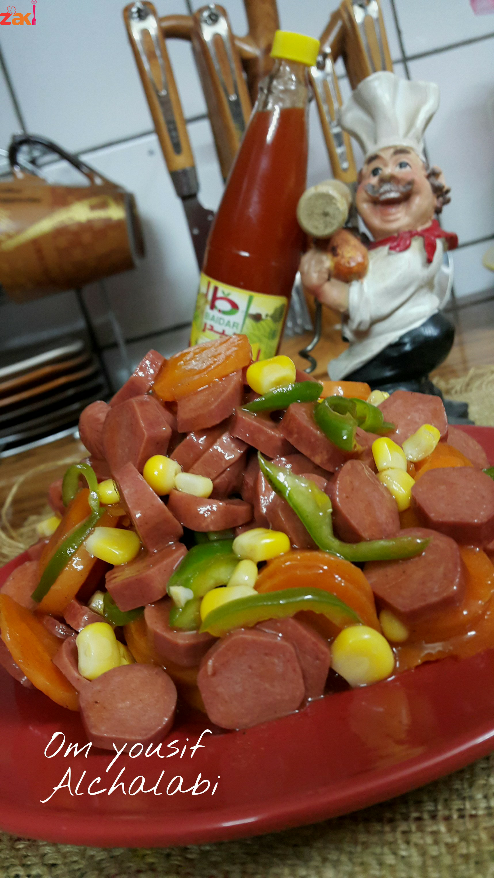 - خمس قطع من النقانق(صوصج) مقطعة حلقات جزرة مقطعة حلقات مسلوقة نصف سلق نصف كوب ذرة 2 قطع فلفل اخضر مقطع شرائح رفيعة العمل تخلط المواد ثم تتبل ب 5 ملاعق كبيرة كاتشاب و2 ملعقة كبيرة صاص و2 ملعقة كبيرة دبس الرمان و3 ملاعق كبيرة زيت زيتون ورشة ملح وتترك مدة ساعة قبل الاستخدم وتقدم ومليووون عافية لاتنسووو ذكر والدتي بالرحمة والدعاااء ام يوسف ..