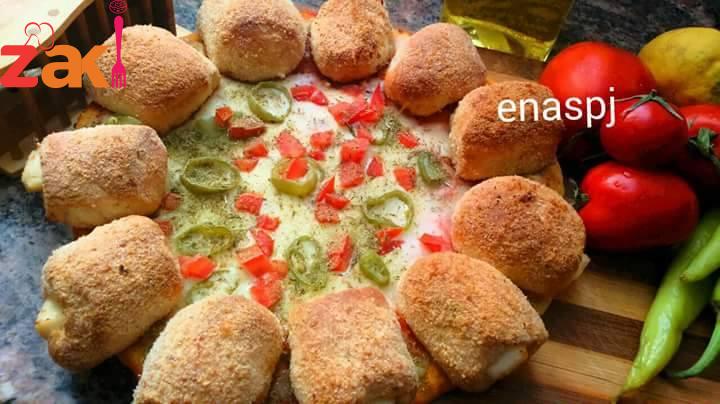 خودي من العجين وشكلي كور افرديها واحشيها جبنة وتونة وزيتون وغطسيها في الحليب ثم الخبز الجاف المطحون. قبل الخبز خلي البيتزا ترتاح ربع ساعة إذا حبيتي زيادة القرمشة رشي الأطراف قبل إدخالها الفرن بزيت الزيتون. والف صحة وعافية