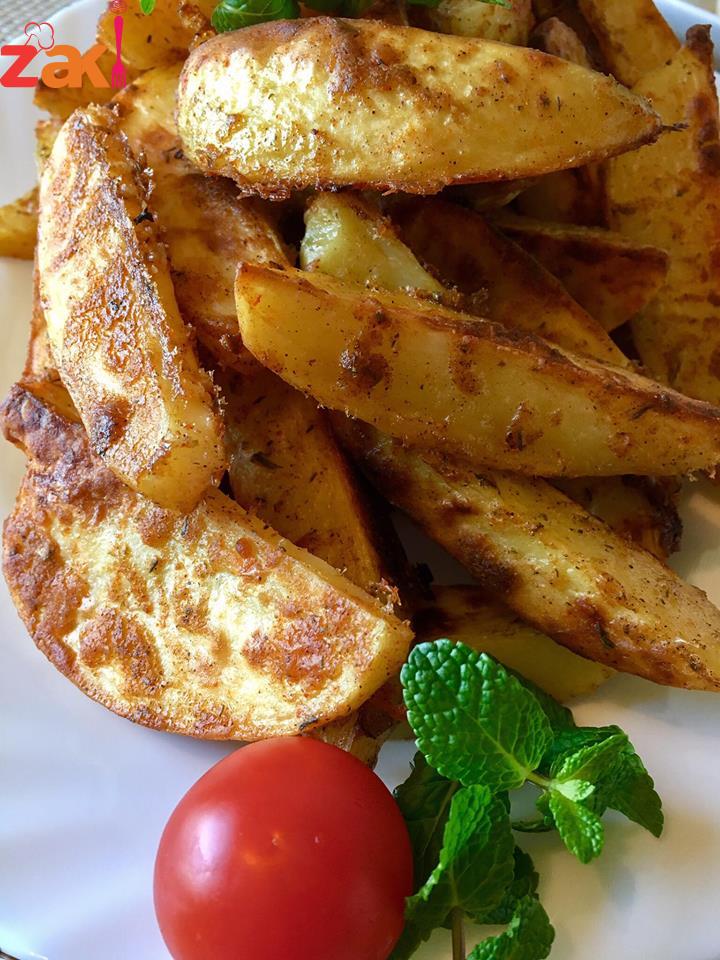 نقطع البطاطا اجنحه ممكن بقشرها او بدون ، ونخلط جميع البهارات والزيت جيدا ونضعها في صينيه وتشوى على درجه حراره عاليه وتقدم ساخنه