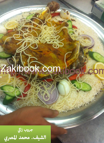– بعد ما يستوى أعطى اللحم صفار زعفران وتدخل الفرن تأخذ وجه مذهب وجميل ثم احضر الصحن أشيل وجه الأرز على جانب اغرف الأرز في الصحن على الوجه المكونات الى عندي ثم الحم، ومكرونة سباجتي للجرنش مع بيض مسلوق. وقشطة كده.