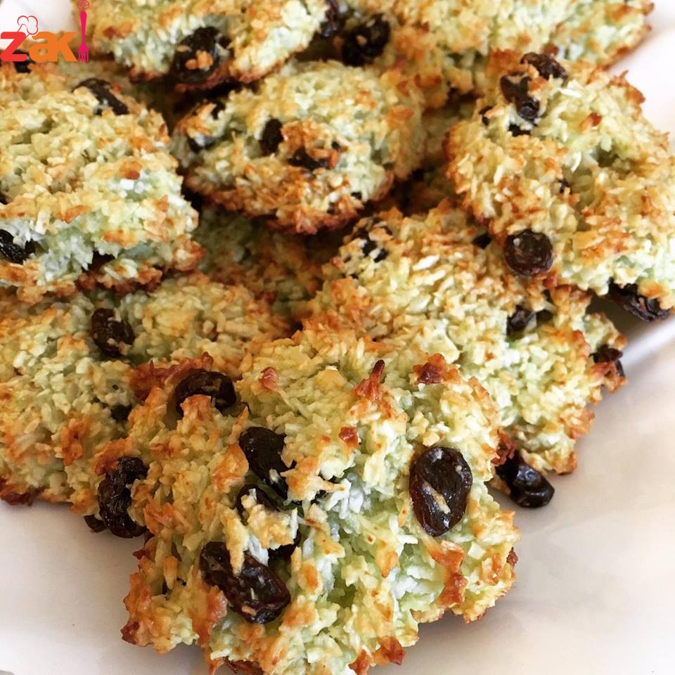 نهرس حبه الافوكادوا ونضيف البيض والفانيليا ونخفق نضيف المحلي وجوز الهند وباقي المواد ونخفق واخر شي الزبيب على صينيه مبطنه ورق زبده وهذا مهم وباستخدام الملعقه نوزع الاقراص نخبزها على حراره وسط حاى لاينحرق جوز الهند وعند الاستواء تبقى بالصينيه حتى تبرد تماما وتتماسك يحفظ بالبراد .