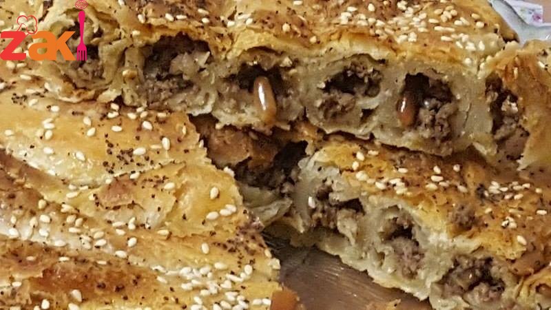 على سطح طاولة أو بلاطة ندهن زيت زيتون ونبدأ نمد العجينة حتى تصبح شفافة نضع اللحمة على وسطها بالطول ونبدأ بلفها ونعمل ها على شكل حلزوني بس نخلص الكمية ندهن الوجه بالبيض المخلوق مع معلقة زيت زيتون ونرش السمسم وزينة الخبز وادخلها الفرن وبس تتحمر نخرجها وندهن وجهها بالزبدة ونرجعها دقيقة عالفرن …وصحتين وهنا