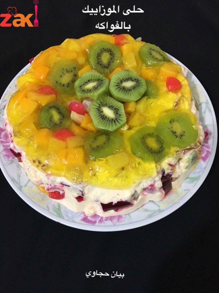 تضاف مكعبات الجلي وباقي الفواكه ثم يضاف باقي خليط الحليب