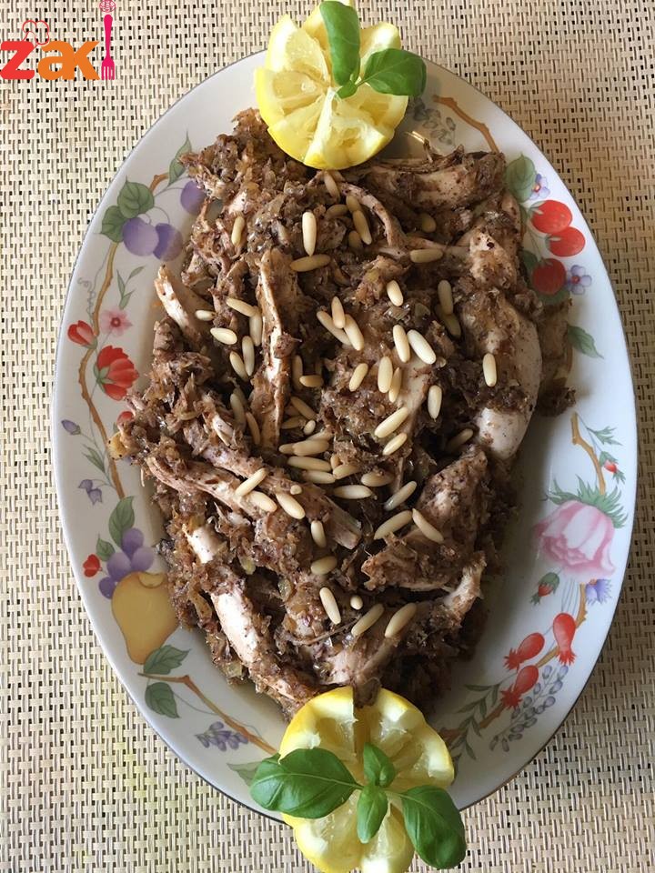 عند نضج الدجاج أما نحمره بالفرن حتى يأخذ لون جميل واذا اردنا عمله مسخن رول نفصل اللحم عن الجلد والعظام ونخلطه مع البصل ونزينه بالصنوبر او اللوز او الاثنين معا حسب الرغبه اما اذا اردنا عمل مسخن بطريقه الرغيف المفتوح ندهن رغيف الخبز بخلطه البصل ثم نضع الدجاج المحمر على الوجه ونزينه بالصنوبر ويقدم.
