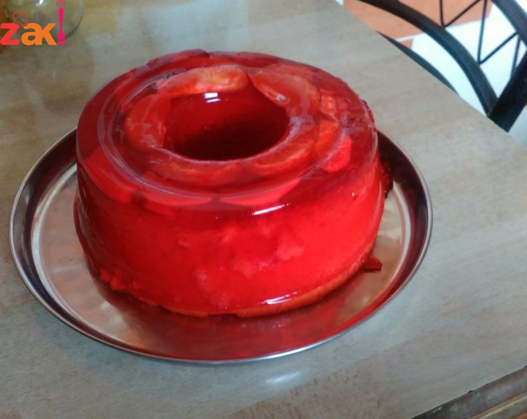 وبعدين عملت تلات باكيتات جلي نباتي طبعا نفس النكهة وخليته يبرد عشر دقايق وبعدين حطيته فوق الكيكة وبهيك بكون الجلي غلف الكيكة ما تشربها