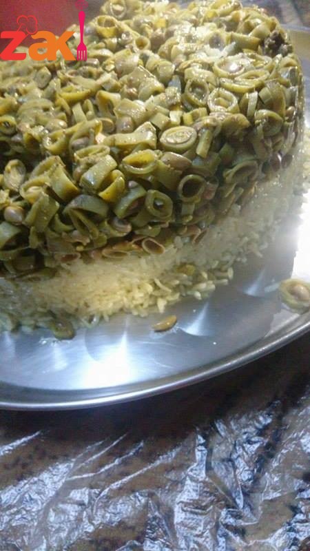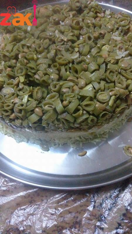 بتسحبي عروق الفول وبتقطعي وبتغسلي وبتصفي بتحطي بطنجره مع زيت قلي وكم سن توم وبتقليهم منيح بتحطي من مرقه الجاج عليه ليستوي الفول وبتملحي بتضيفي الجاج والرز المنقوع ربع ساعه المي لفوق الرز بعقدة اصبع