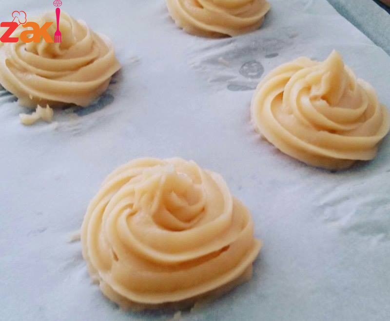 مع الاستمرار في الخفق بالمضرب الكهربائي سرعة متوسطة. يُصب الخليط في كيس الحلواني أو بتاع الكريمه ونشكله زي ما نحب بس نشكل حجم وسط علشان بنتفش بالفرن