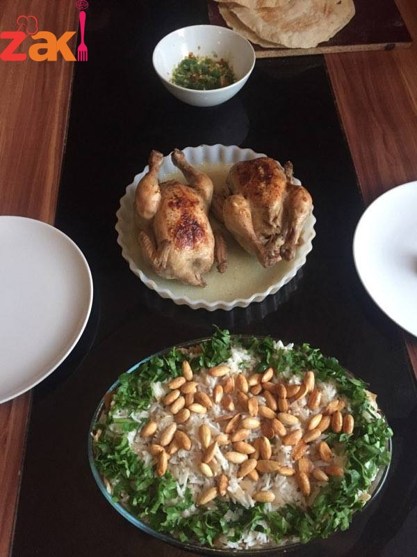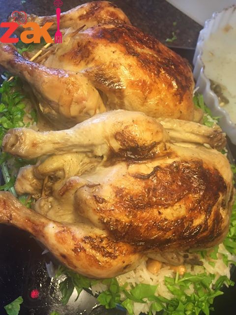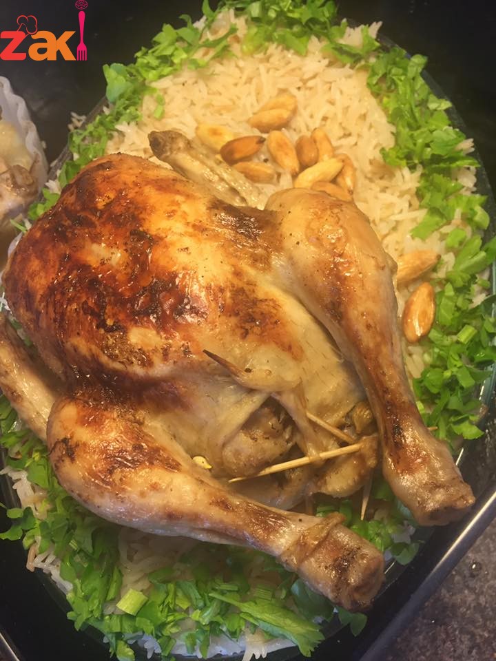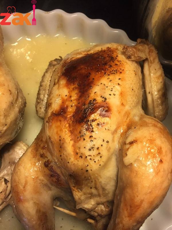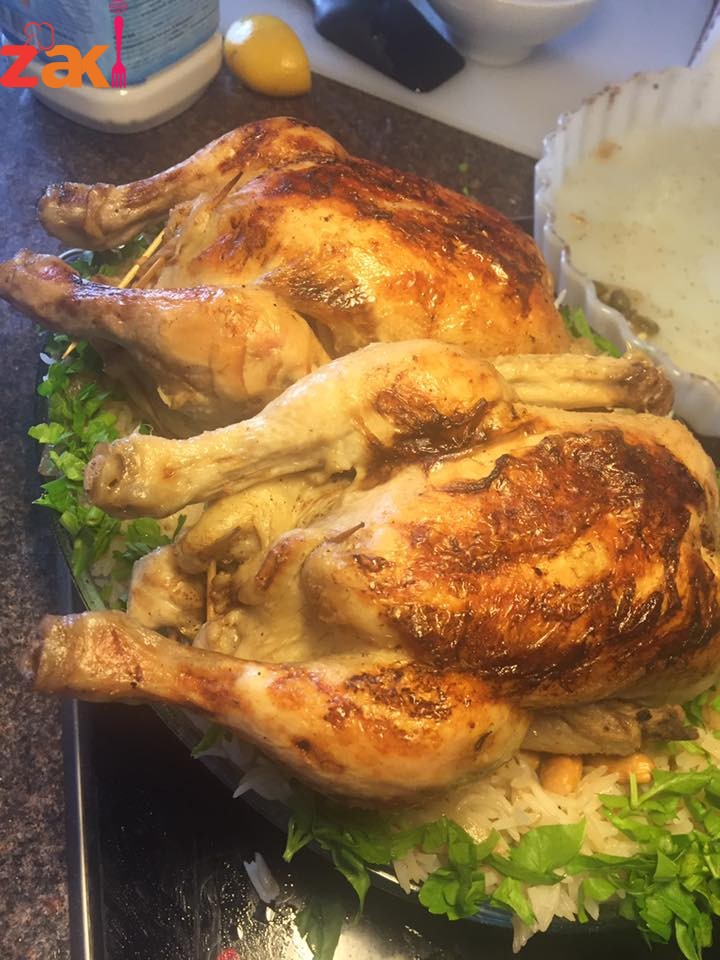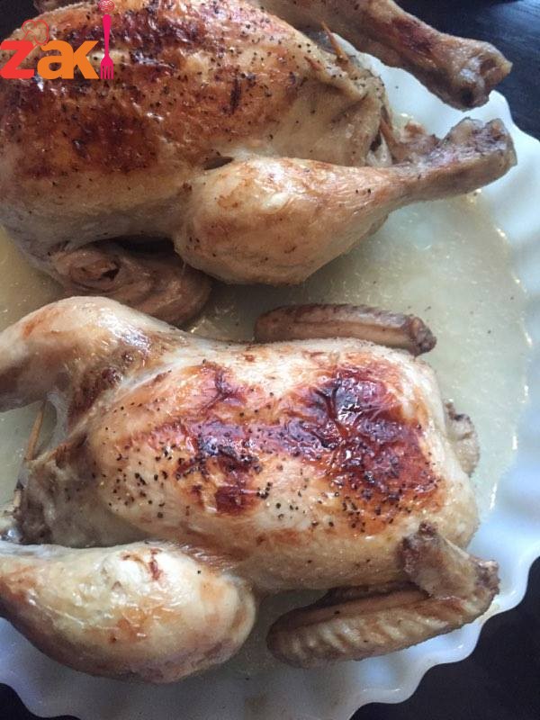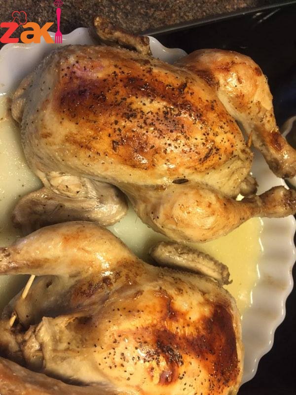 ندهن الدجاج بزيت نباتي وليمون حتى يأخذ اللون الذهبي الدجاج بالفرن ونخرج الدجاج من الفرن بعد ان ياخد اللون الذهبي