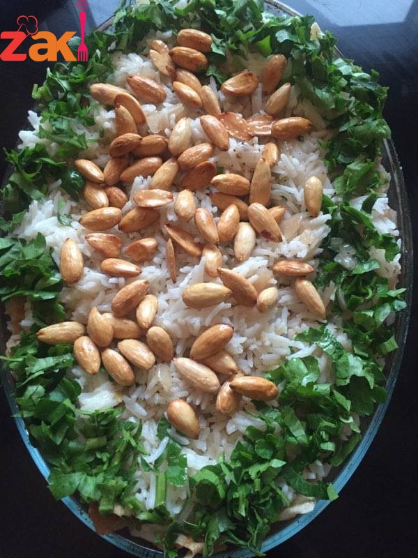 ثم نزين وجه الفتة باللوز المحمص بالزيت النباتي