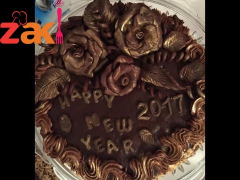 كيك الشوكولا محشي فواكه ومغطى بلكريمة الزبدة ومغطى بلغناش ومزين بعجينة الشوكولا