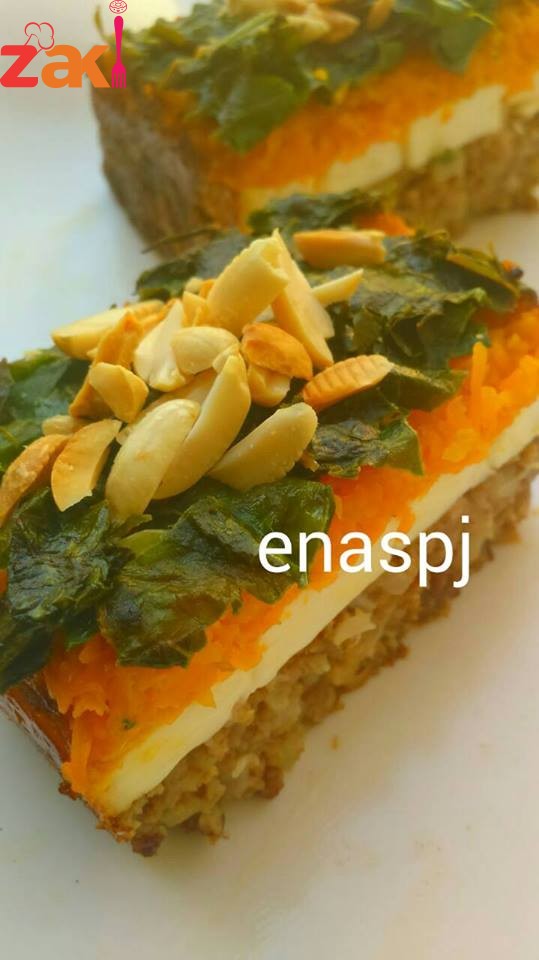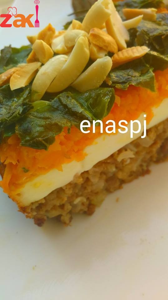 لحم مفروم مع بصل وثوم وبهارات بيضاء (زنجبيل وفلفل ابيض وحبهان) وبيض وملح خلطيهم مع بعض وحطيهم في طاجين ويفضل طاجين التوست المتوسط الحجم ويكون مدهون زبدة ورشة خبز جاف مطحون الطبقة الثانية جبنة ريكوتا مع ملح مضروبة مع بيض واذا مش متوفرة تستعملي كيري
