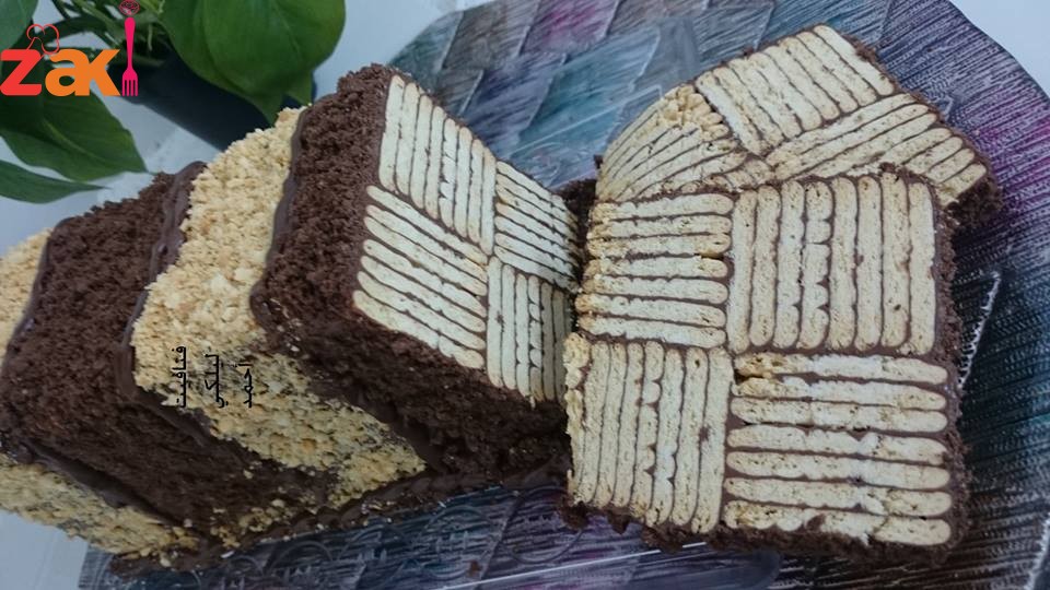 احضري البسكويت, وصفطيه كما في الشكل, والصقي كل طبقة مع الأخرى بالقليل من خليط الشكولاتة, ثم اسكبي ما تبقى من الخليط على الوجه, وضعيها في الثلاجة حتى تتماسك.