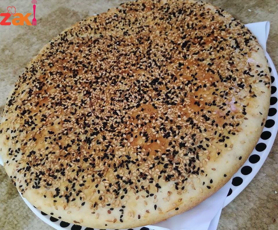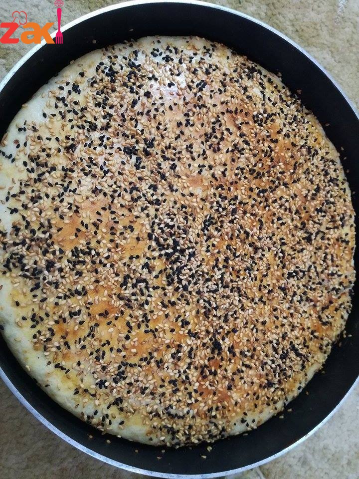 اربع كاسات طحين و كاسة مي و نص كاسة حليب سائل دافئه و ربع الكاسه زيت قلي و معلقه كبيره خميره ة معلقة سكر كبيره و نص معلقة ملح صغيره و معلقه صغيره بكنج باودر بتعجنيهم مع بعض،حتى تتماسك العجينه مع بعض و بنغطيها و بنخليها تخمر شي نص ساعه بعدها بدهن الصينيه زيت و بحط العجينه فيها بس بخليها خميله شوي و ع جنب بكون محضره بيضه مع معلقه صغيره خل و بخلطهم مع بعض و بدهن وجه العجينه و برش عليها سمسم و قزحه …