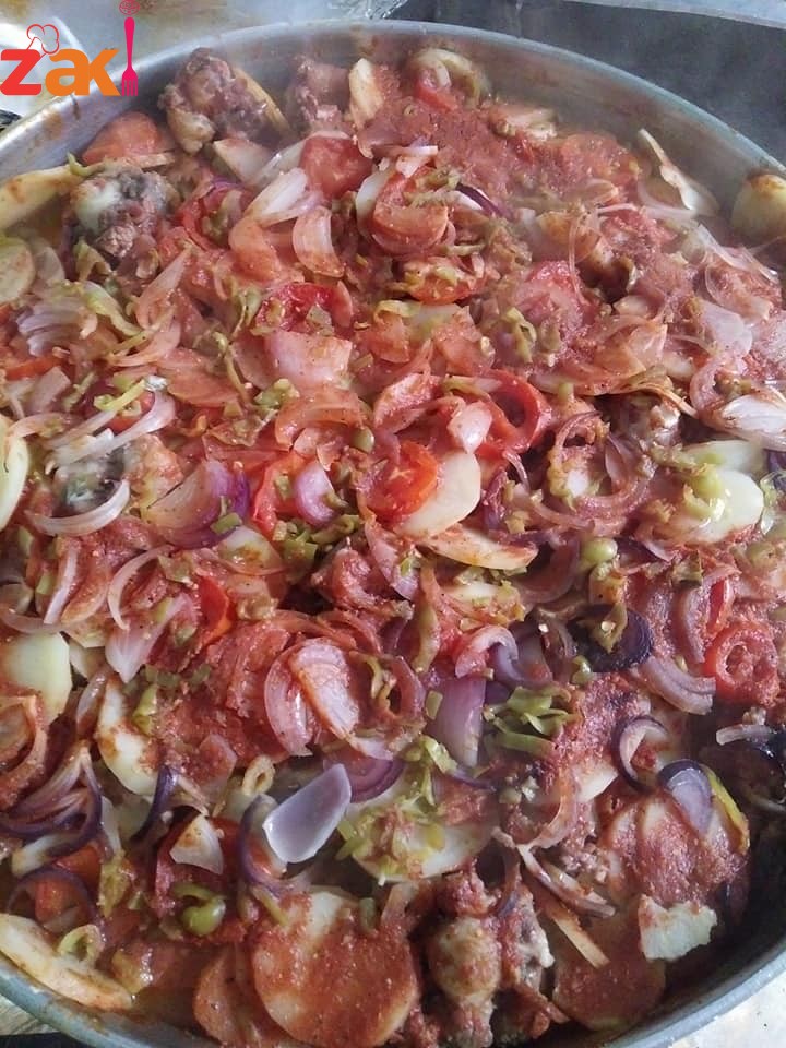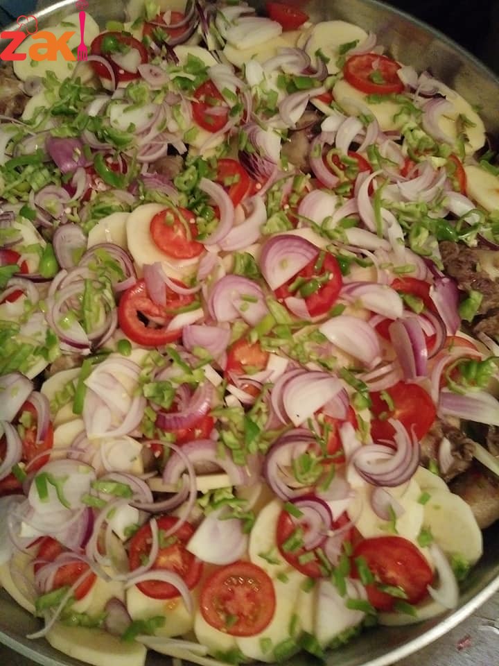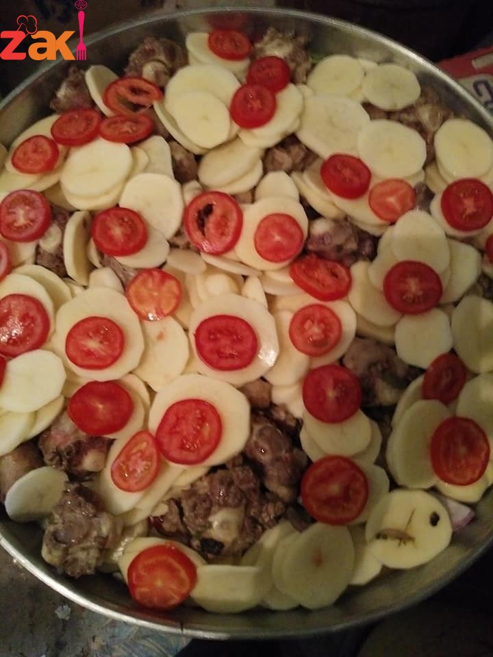 وبعدين طبقة بطاطس وبعدين العكاوي وبعديها البطاطس وعلي الوش بصل طماطم فلفل وبعدين نضرب شفشق طماطم وعليه الملح الخفيف والفلفل الاسمر والخولنجان وترشيها علي وشها وتدخليها الفرن وبالهنا والشفا ^_^