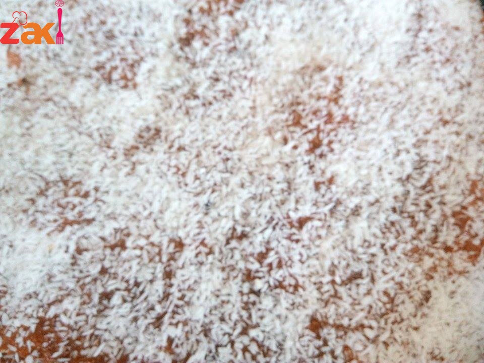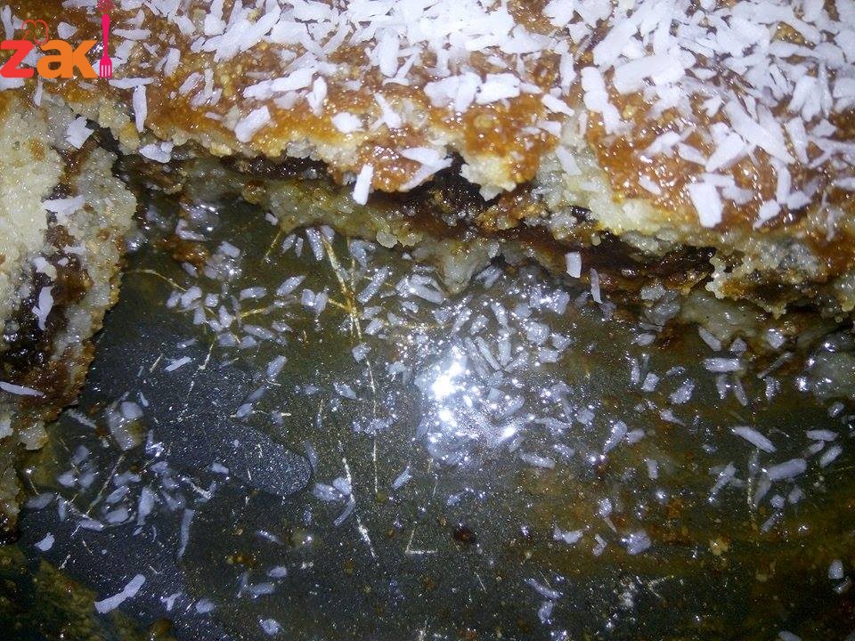 حتي اتغطي كل الصينيه وبعدين نسكب باقي الخليط ويفرد جيدا وتحمر ثم نسكب القطر عليها وتزين بالجوز