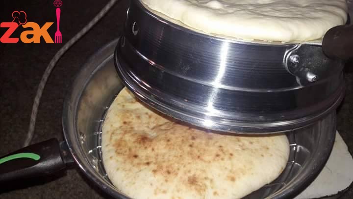 ثم يعجن بماء دافي لمدة ربع ساعه حتى تحصلي على عجينه طريه وناعمه وآخر شيء يدهن الوجه بزيت الزيتون ويغطى بنايلون ويترك ليختمر لمدة 30 دقيقه ثم يقطع ويرق ويريح 10 دقائق ثم نخبزه كما هو موضح بالصوره
