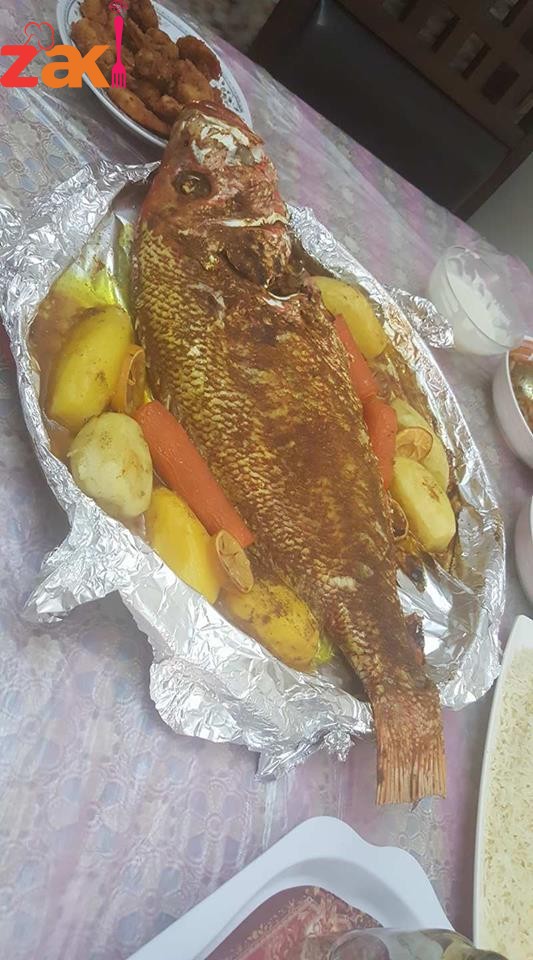 وبحطها بالفرن وبحط معها خضره مشكله وشرايح ليمون بتاخد بالفرن شي ساعه على حسب حجم السمكه وسويت جنب السمك قريدس مقلي بالبيض والبقساط وسلطه وصحتين وعافيه