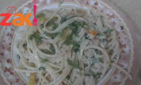 مكرونة فيتوتشيني مسلوقة-صدور دجاج مسلوق ومقطع-نصف كوب كريمة طبخ-نصف كوب حليب مضاف آلية 2ملعقة طحين-بقدونس مقطع صغير-ملح وفلفل في طاسة نضع القليل من الزيت ثم الدجاج ونقلب جيدا نضيف الملح والفلفل،ثم المكرونة وأخيرا الكريمة والحليب وتوضع في طبق التقديم وتزين بالبقدونس