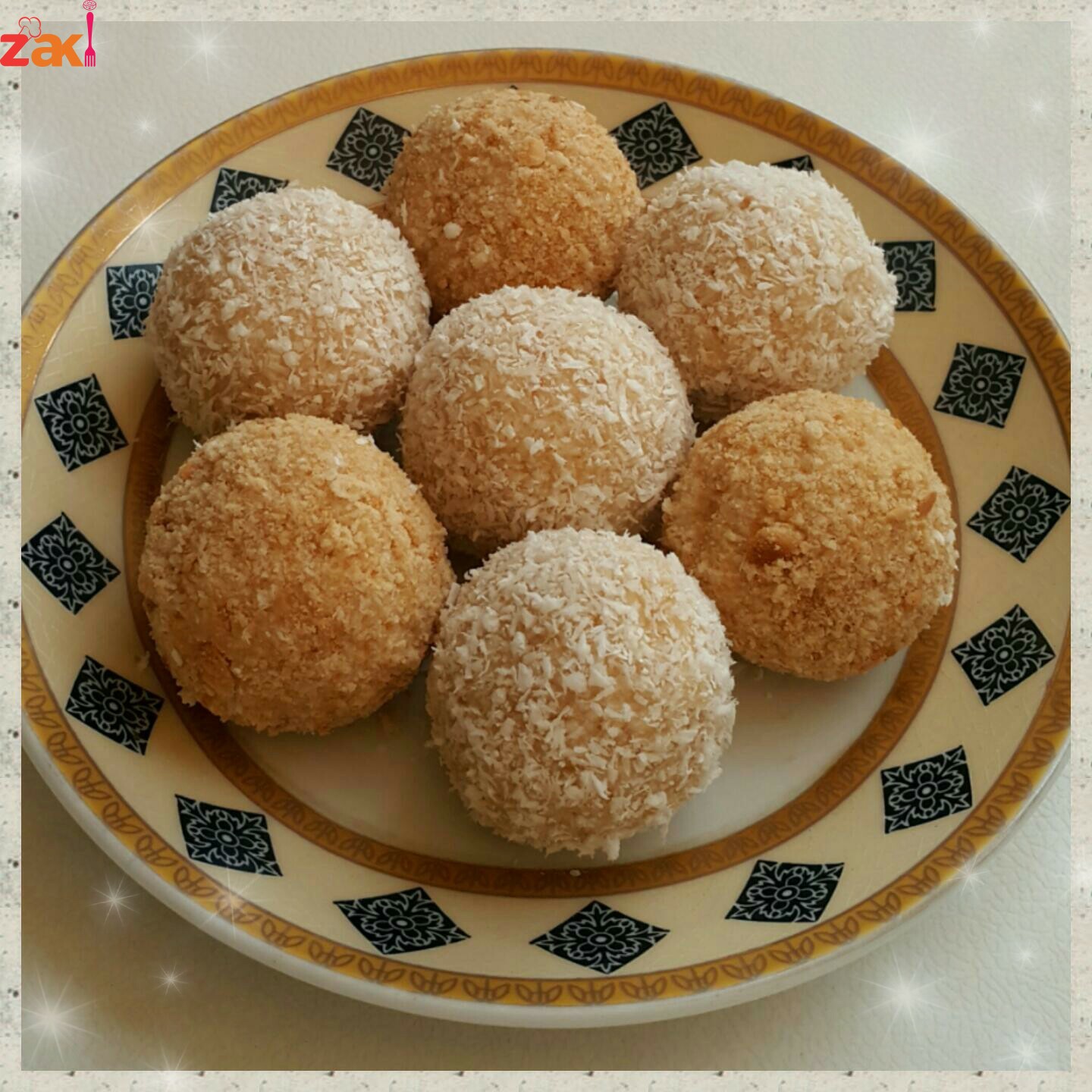 نخلطهم جيدا ونشكلهم إلى كرات وندحرجهم فوق جوز الهند أو البسكويت المطحون..