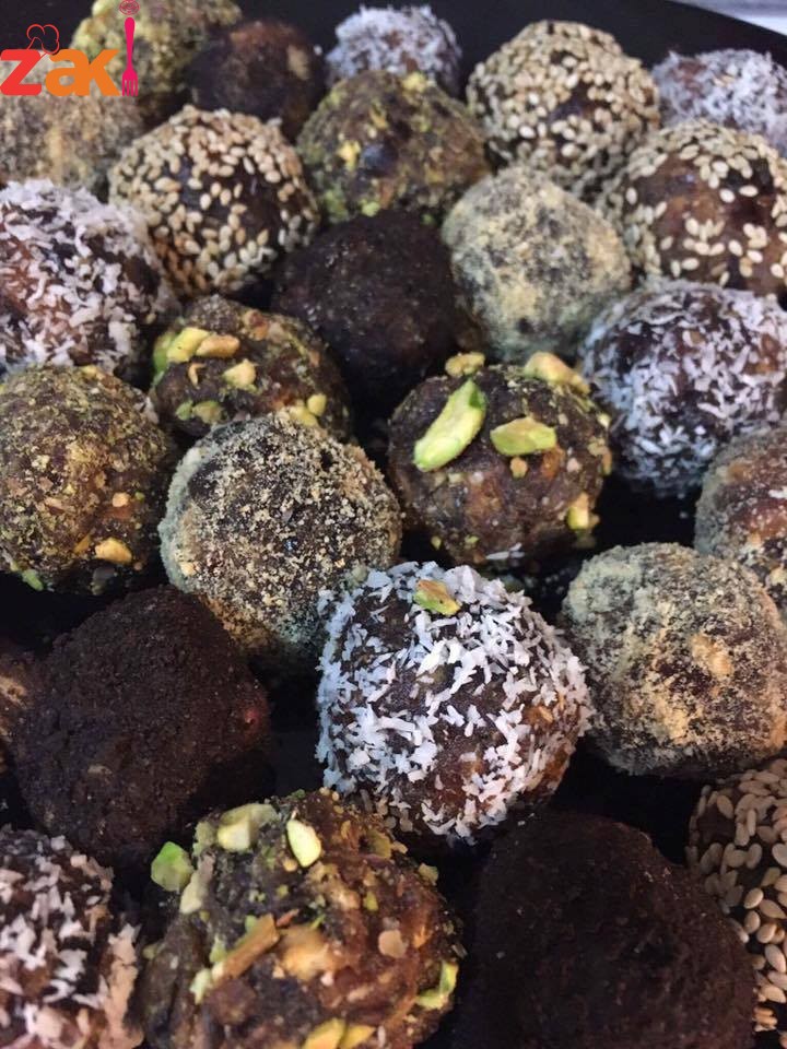 تعجن كل المكونات وتكور الى كرات التغطية سمسم محمص او اوريو مطحون او جوز هند او بسكوت سادة مطحون او فستق مطحون