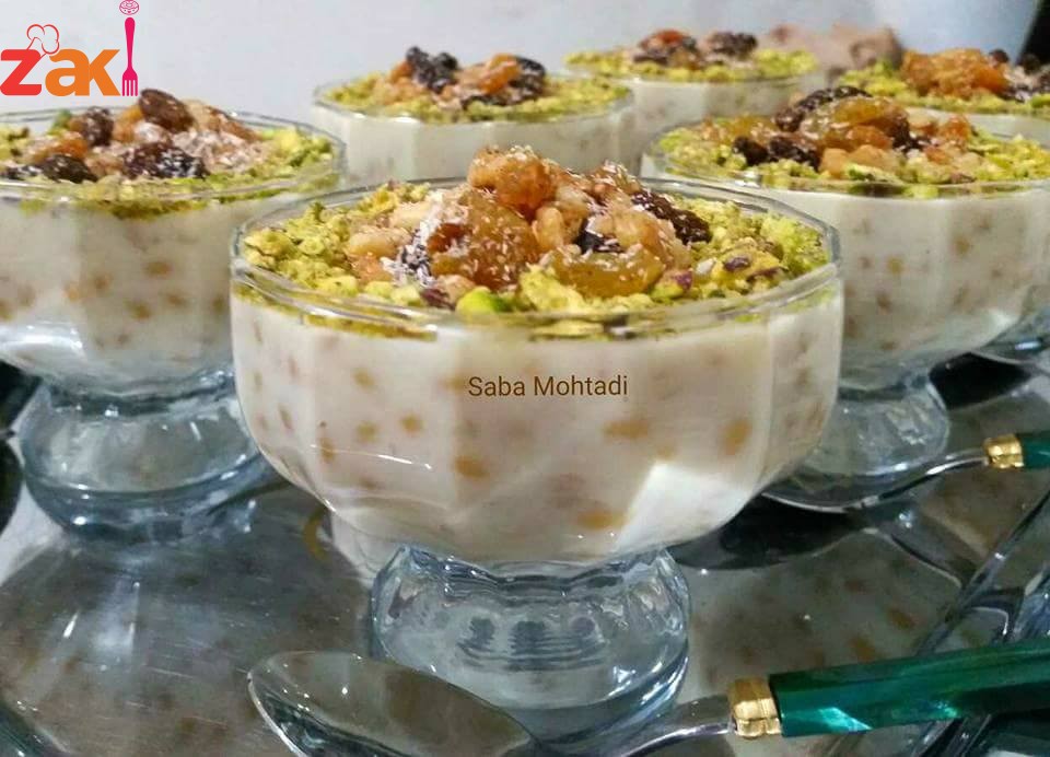 زينتها بالزييب والمكسرات ) جوز وبندق وفستق حلبي ( مع رشة جوز هند ورشة