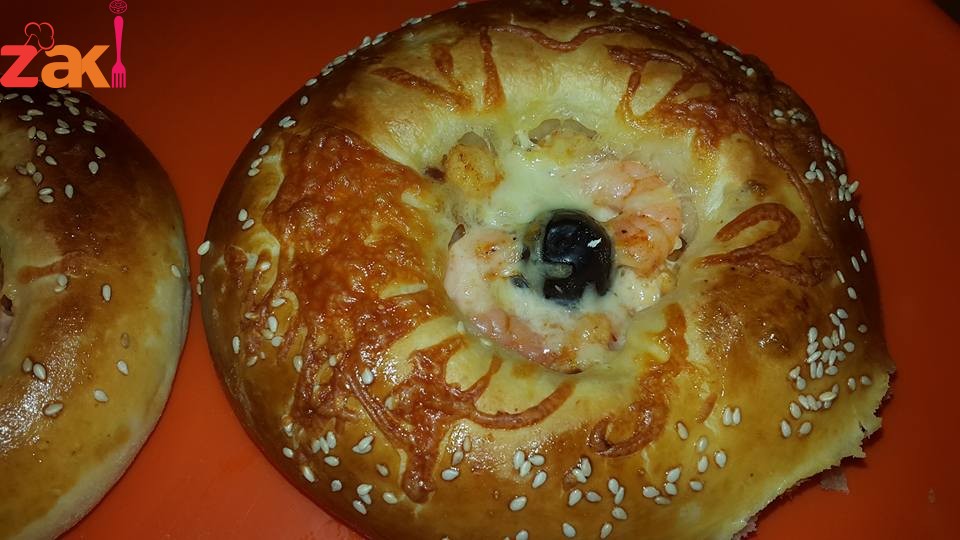 2 كاسات مي دافيه و 2 كاسات طحين و 2 ملاعق خميرة خبز و 2 ملاعق سكر تخلطيهم منيح و تخليهم يخمرو بعدين ضيفي 3 كاسات طحين و نص كأس زيت و 3 ملاعق كبيره حليب بودره و ملعقه صغيره بيكنج باودر تعجنيهم منيح و تشكلي متل مبين بالصورة و الحشو لي من برا سمك صول مقطع و عليه بهارات و جمبري كمان و حبه زيتون و رشه جبن شيدر و عالفرن و صحه و هنا بصراحه شي ناهي