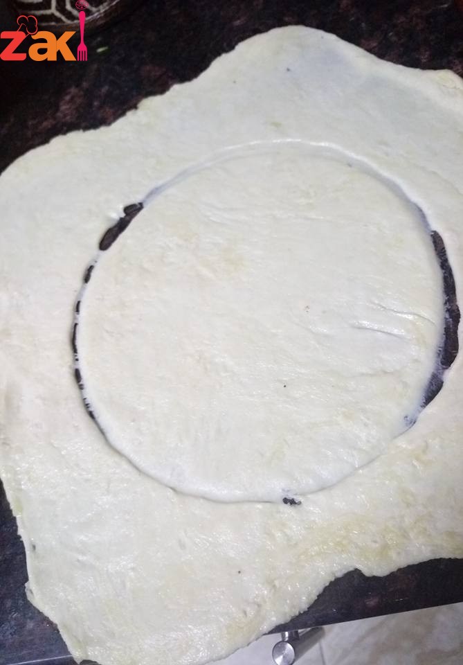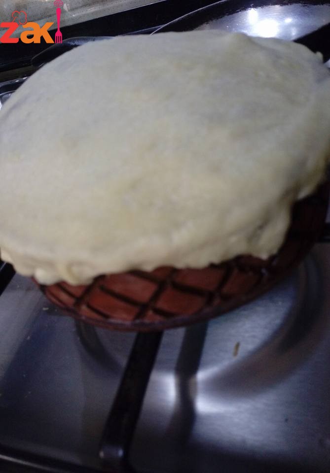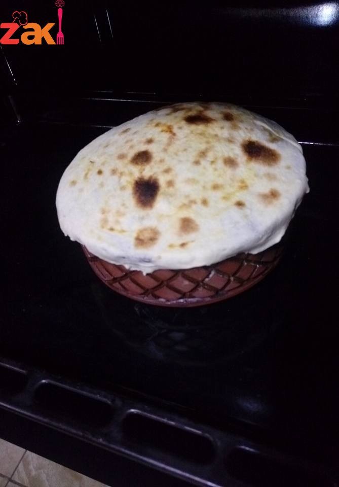 بالفخارة بحط اللحمة المقلبة والخضار والباذنجان وبسكب فوقهم مقدار كاسة مي مغلية، وبرق العجينة وبغطي الفخارة فيها وبحطها بالفرن لمدة ساعة وبعدين بحطها تحت الشواية لحتى تحمر العجينة شوية وممكن تحمر بالفرن بدون شواية