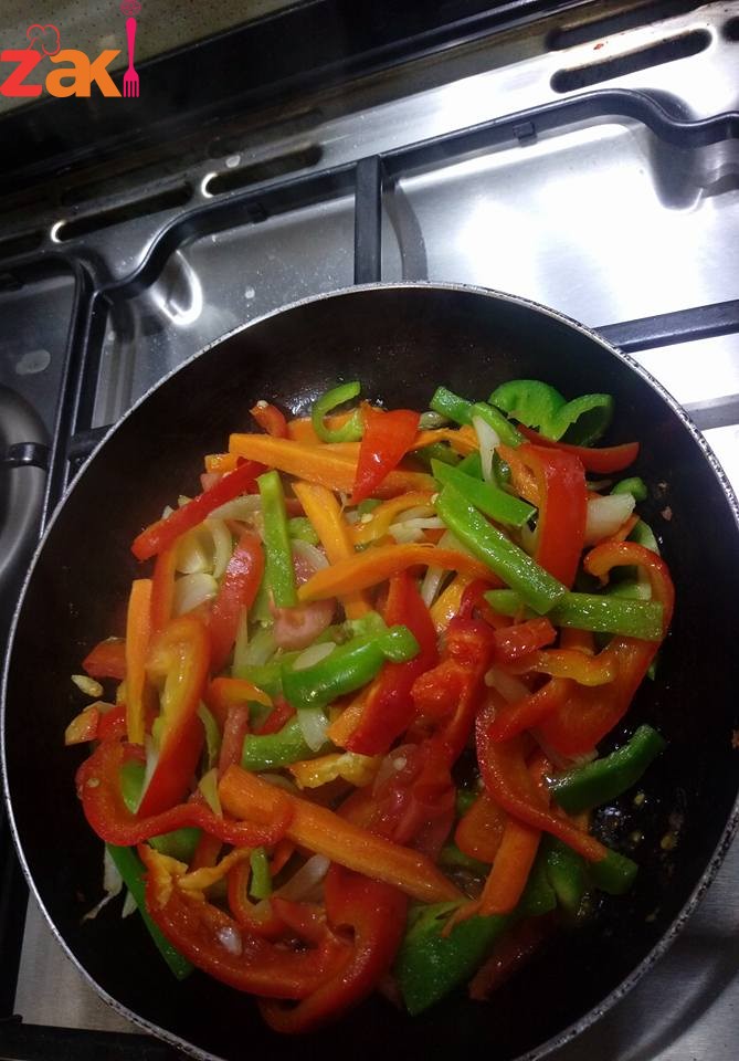 بقلب اللحمة اولا بزيت ذرة لحتى يصير لونها ذهبي ،بشيل اللحمة وبنفس الزيت بقلب كل الخضار وبضيفلهم الملح وجميع البهارات الموجودة