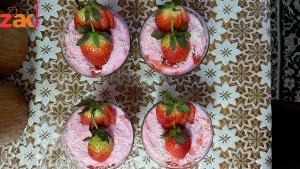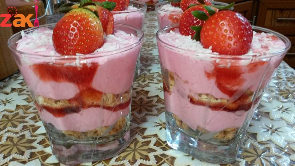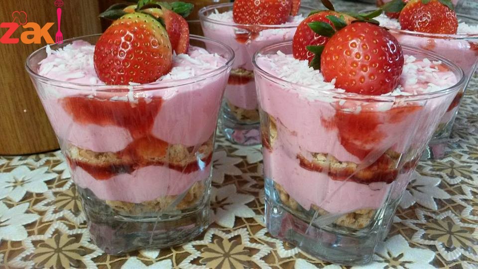 نخفق كيس كريم شانتي بطعم الفراولة مع كوب حليب سائل ونضيف اليه ملعقتين كبيرتين جبن كريمي وربع علبة قشطةونخلط جيدا،ثم نضيف اليه نصف كوب من صوص الفراولة ونخلط قليلا بالملعقة، نكسربسكوت قطع ناعمة ونوزعه بالكاسات ثم نضيف طبقة من الكريمة ونوزع فوق الكريمة صلصة فراولة ثم نضع طبقة اخرى من البسكوت المطحون ونضع طبقة من الكريمة نوزع ايضا فوق الطبقة الاخيرة من الكريمة صلصة فراولة ونزينها بالفراولة يوضع في الثلاجة حتى يبرد قليلا ويقدم .