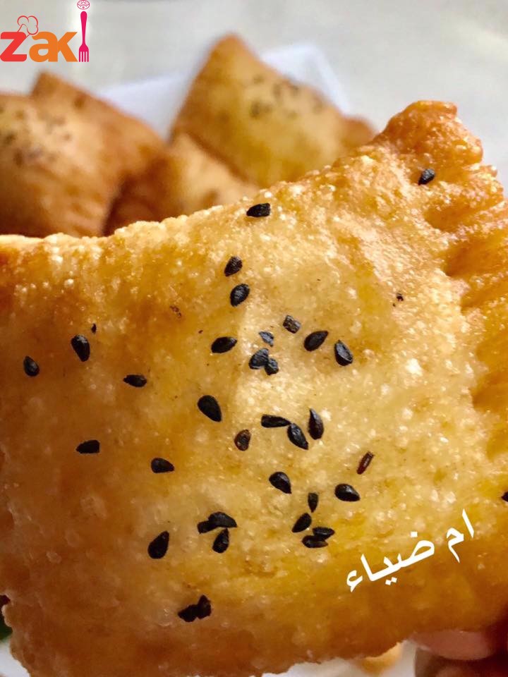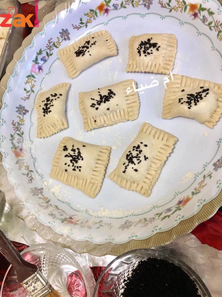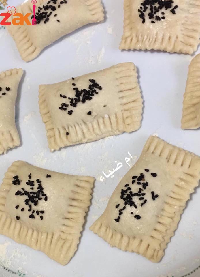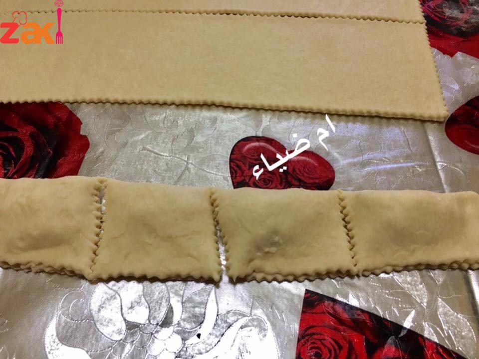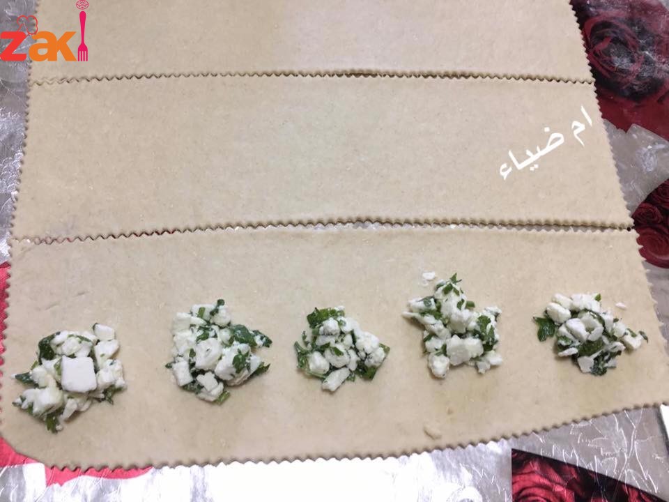 - تفرد العجينة بواسطة الشوبك على شكل مستطيل سمك 0.25 سم ثم تقطع لاربعه مستطلات توضع الجبنه من الطرف وتلف العجينة ونضغط عليها بطرف الشوكه ثم تعمل على شكل مربع وتصف على صينية