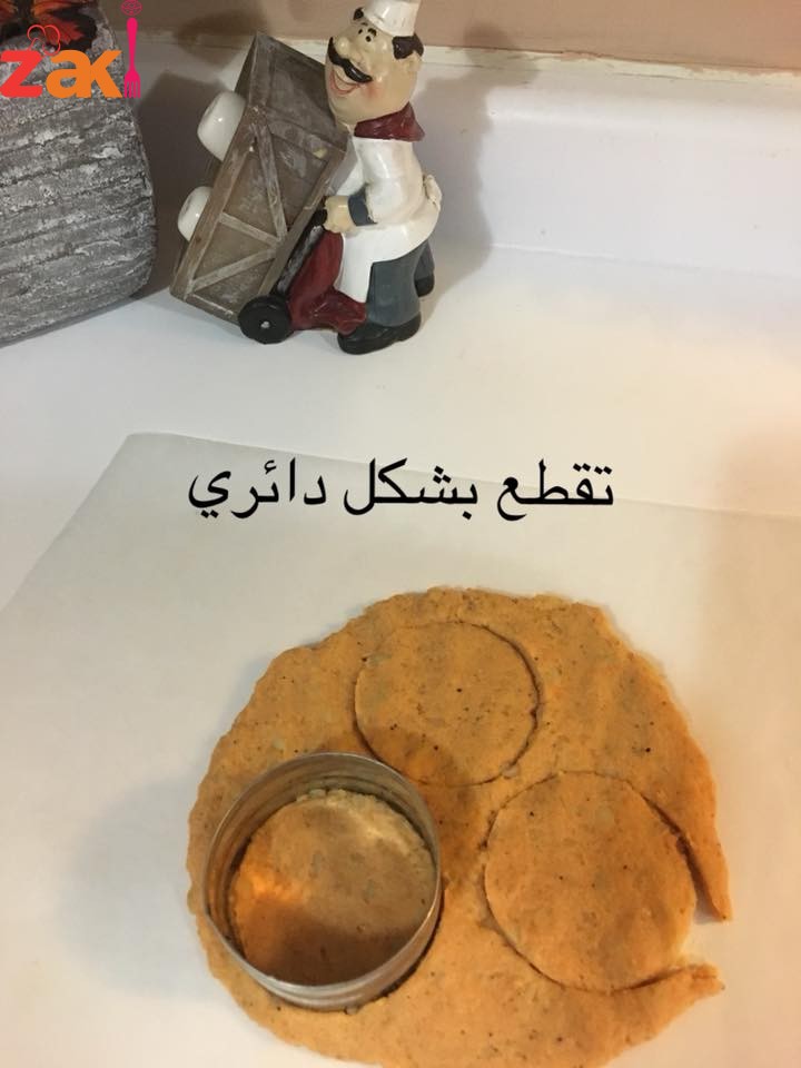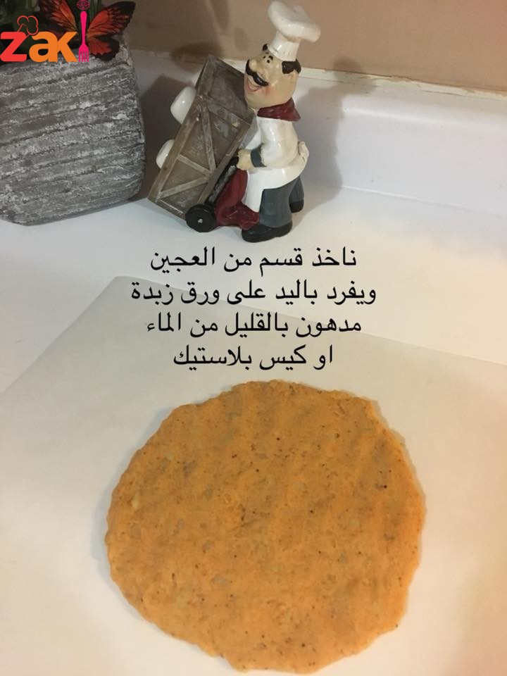 بعدها نأخذ قسم منها وتبسط باليد على ورق الزبدة مدهون بالقليل من الماء