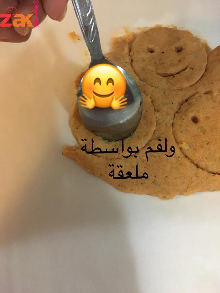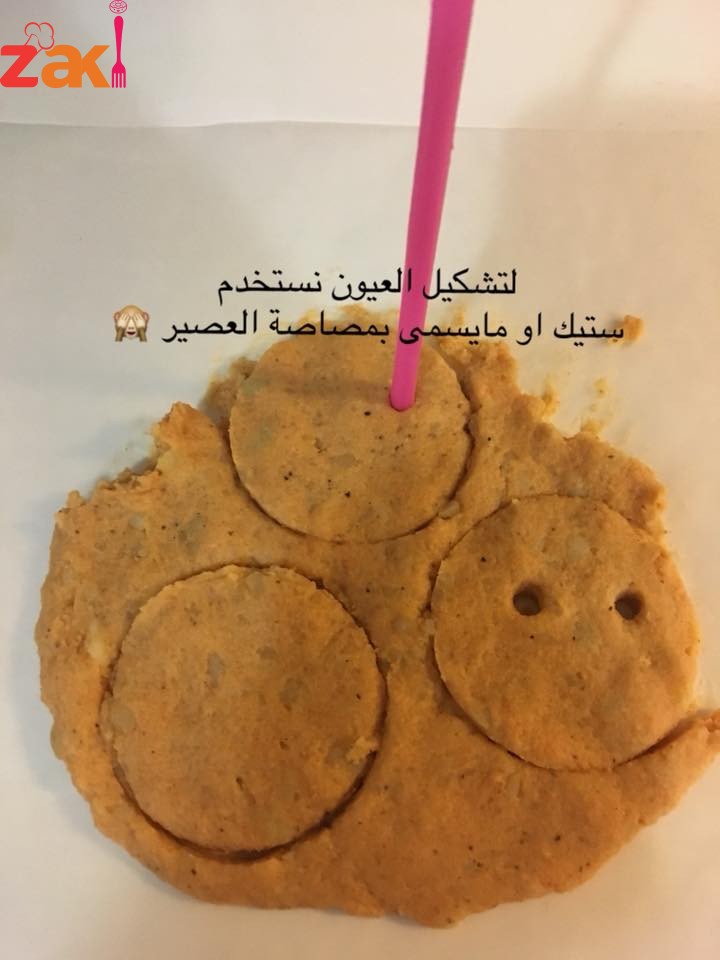 تقطع بشكل دائري ثم نستخدم الشفاطة تبعت العصير لعمل عيون وطرف الملعقة لنعمل الفم