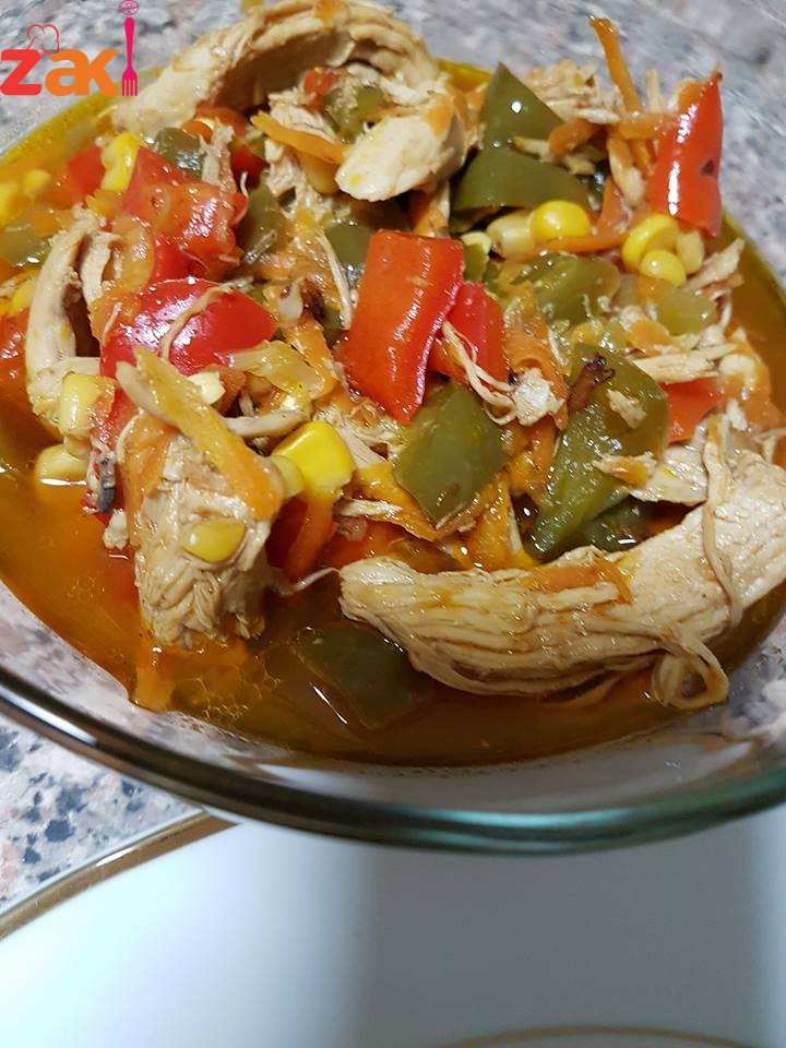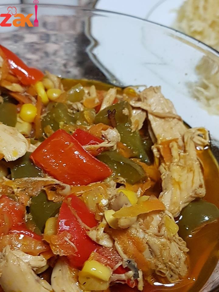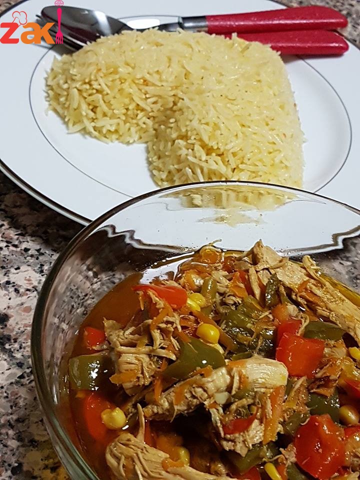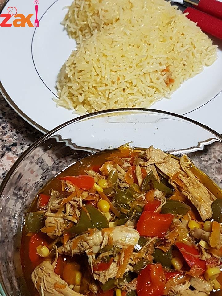 3 كوب أرز أمريكي3 حبات فلفل أخضر رومي3 حبات فلفل أصفر2 حبة فلفل أحمر4 حبات جزر كبيرة4 حبات بصلراس ثومملعقة زنجبيل مطحونقليل من الكاشو (كاجيو)عبلة فطر (مشروم)دجاجة واحدة مسحبة ومقطعة قطع صغيرةصويا صوص