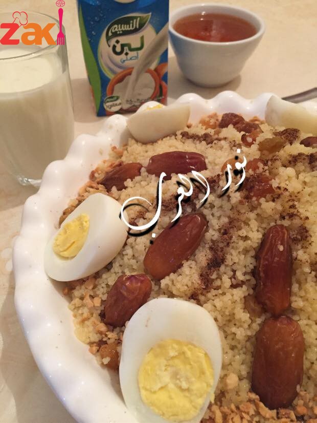وبآخر تبويخه نحط كمية من الزبيب حتى يطرى واخر مرحلة تفرغيه في صونيه وحطي كمية من الزبدة او السمن وشوي زهر وافركيه وحطيه في طبق التقديم وزينيه بالقرفة واللوز او اي نوع مكسرات وتمر ويقدم مع عسل اللي يحب يضيف عسل ومع لبن