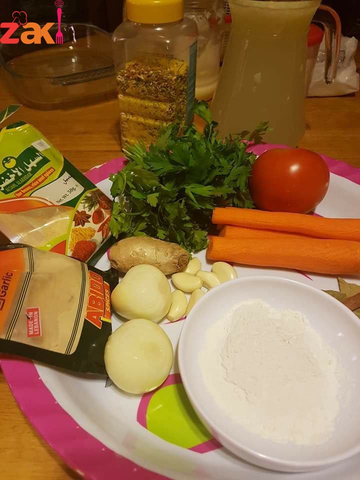 نحمص الطحين مع الزيت ونضيف التوابل مع التقليب ثن نضيف الخليط( مرق الخضار المطحون)