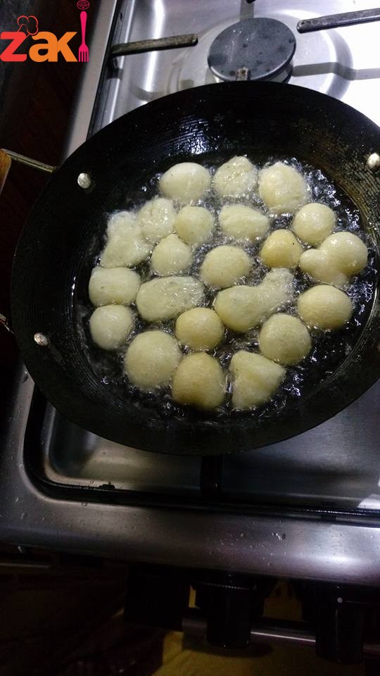 بتجيبي صحن صغير بتحطي فيه زيت ذرة وملعقة صغيرة وبتحمي الزيت ع نار وسط .بتشيلي كمية من العجين بايدك وبتطلعي كرة صغيرة من بين اصابعك وبتغطي المعلقة بالزيت وبتطوولي الكرة وع الزيت مباشرة وبس يشقروا بتشيليهم وبتحطيهم بالقطر وبتشيليهم عالمصفاية حتى نصفي القطر الزايد وصحة وهنا