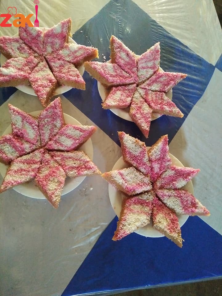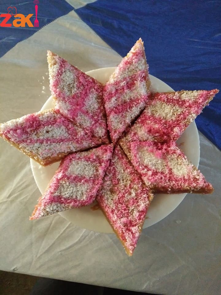 ونجهز صنيه كبيره ونص كيلو جوزالهند وزجاجة شربات فراوله بعد الترديد نقلبها في الصنيه ونسويها كويس ونرش علي وشها جوز الهند وبعدين الشربات نتركها ساعه لتبرد وبالهنا والشفا