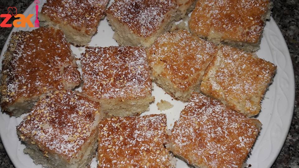 بنخلطهم سوا وبندهن الصينيه طحينيه وبنسكب الخليط وبنحطهم بالفرن على نار هاديه وبس تجهز بنسكب عليها القطر البارد وبنرش جوز الهند