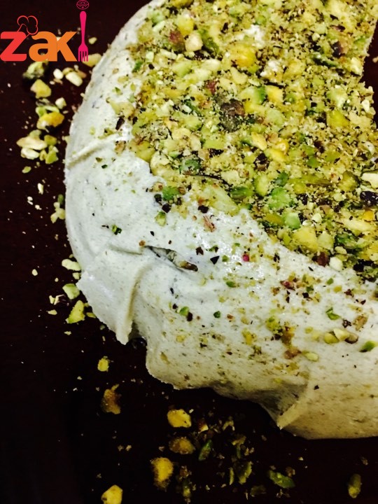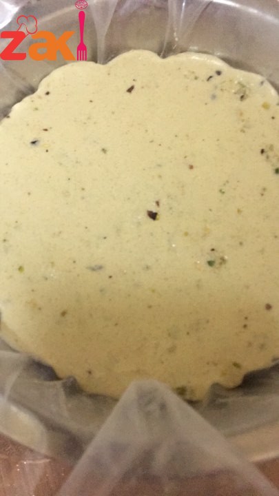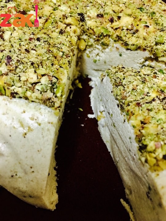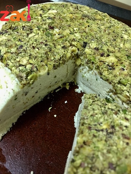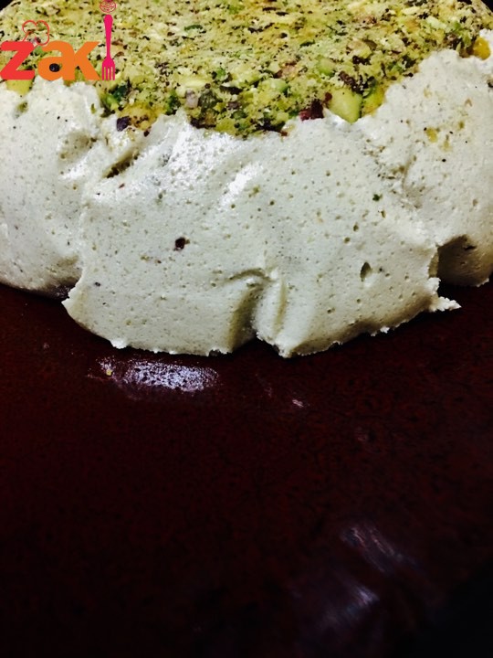 ثم نضع نايلون في صحن غميق ونرش الفستق الحلبي ونضع الحلاوة عليه ونضعها في البراد لمدة ساعتين وممكن تناولها فورا