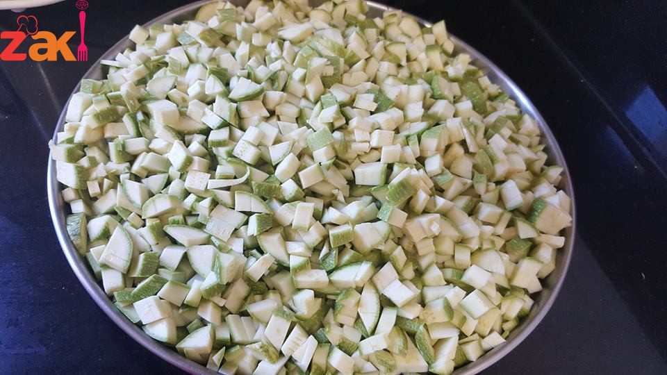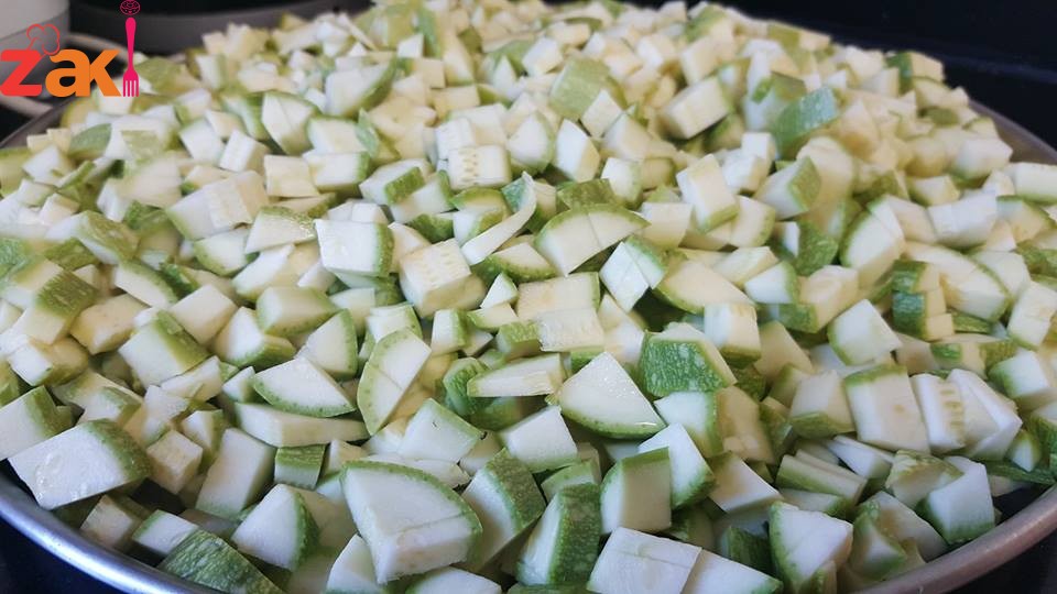 بس يصير لونها ذهبي نضع الكوسا المغسولة والمفرومة مربعات