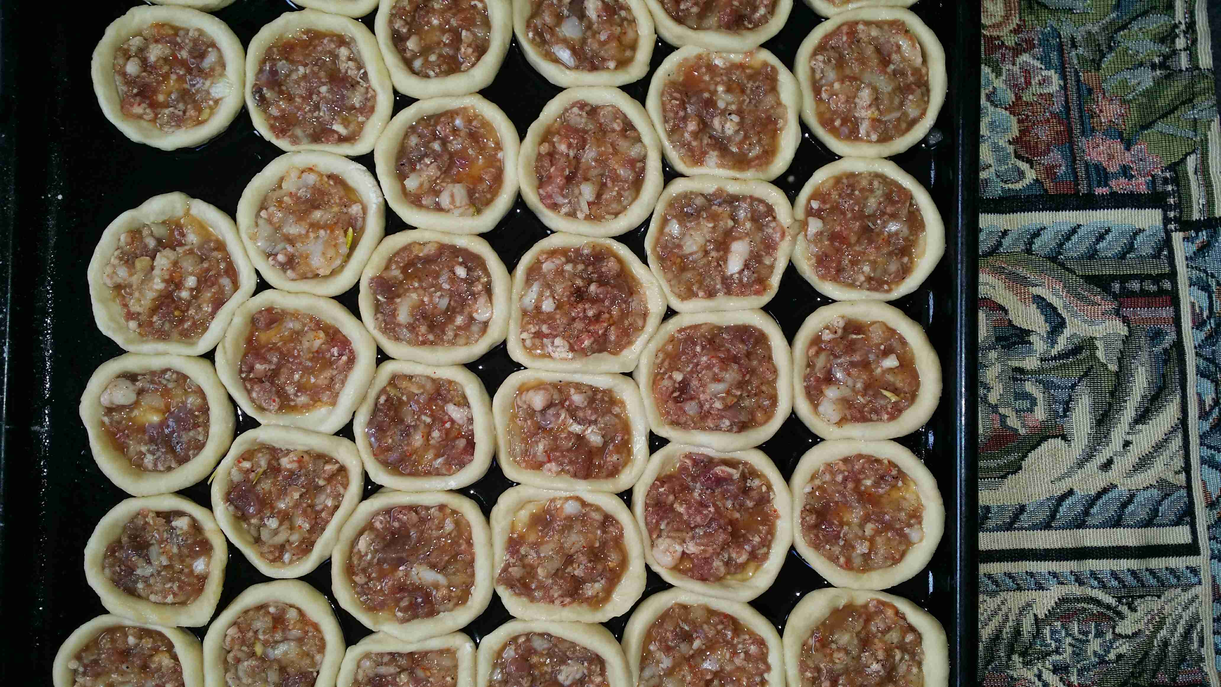 نفرد العجين على شكل أقراص مع عمل أطراف ونضع في المنتصف ملعقة صغيرة من الحشوة, ثم نخبز المعجنات في الفرن من الأسفل حتى تتحمر ومن الأعلى حتى تصبح ذهبية اللون, وصحتين وعافية.
