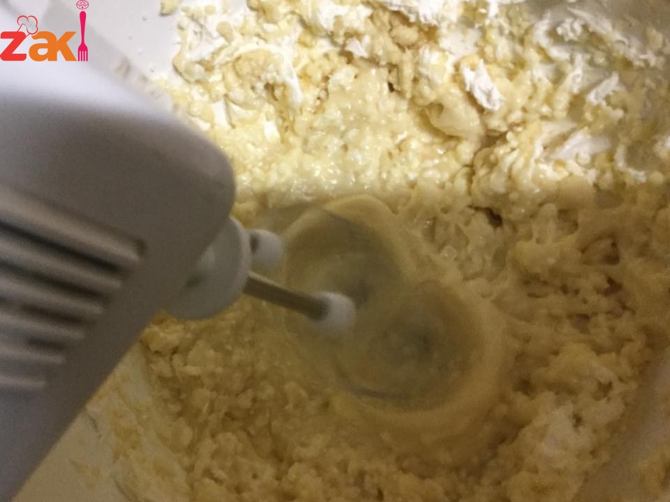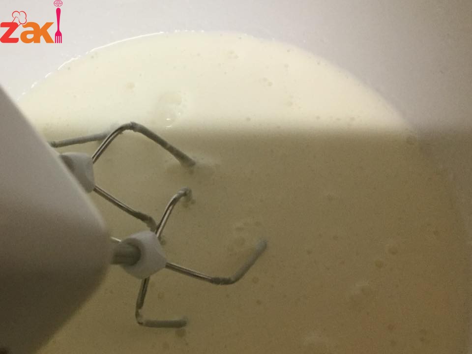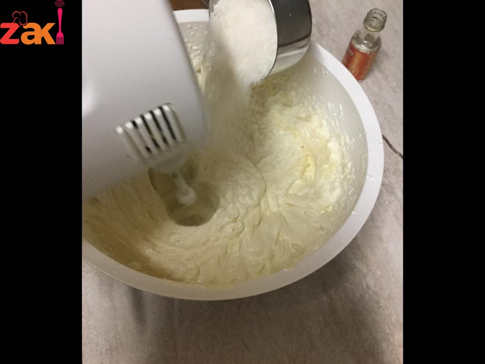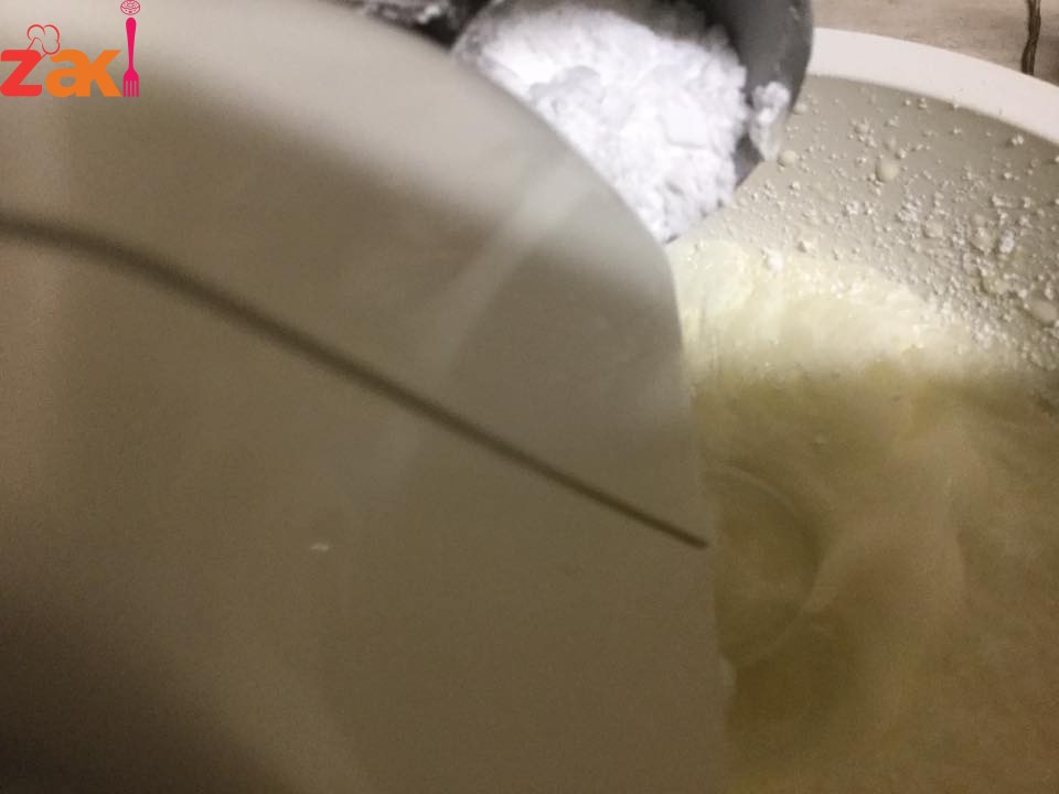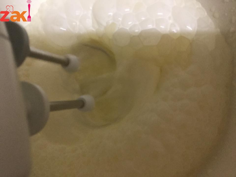 نفصل الصفار عن البياض ومن ثم نضع زرة الملح على البياض ويخفق حتى يتكاثف شوية ثم نضع السكر ونتابع الخفق حتى يصبح لدينا مثل الميرنغ الجامد