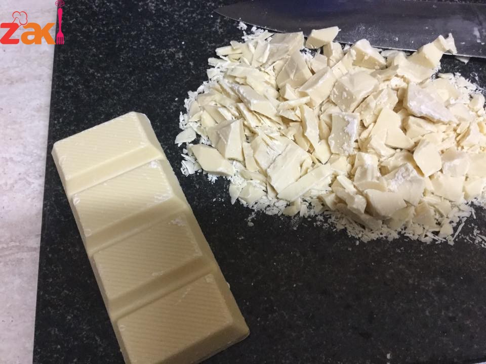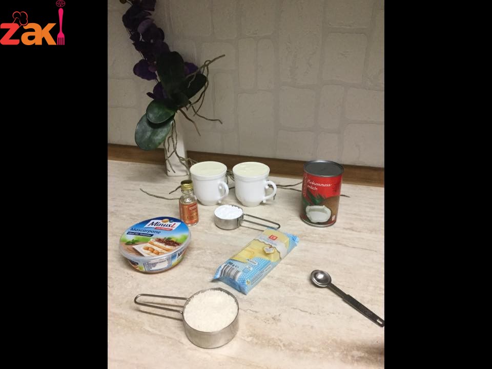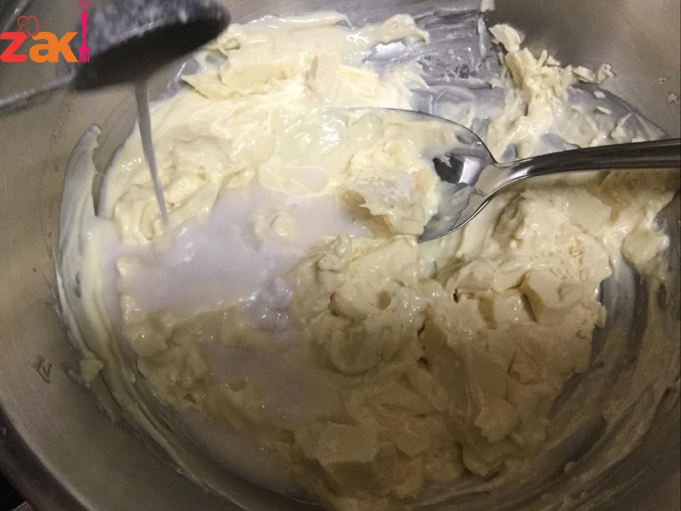 البودرة ومن حتى تصبح جامدة نضع عليها روح جوز الهند ونحرك ثم نضع الكريمة فوق خليط الشوكولا البيضاء مع الجبنة الماسكر
