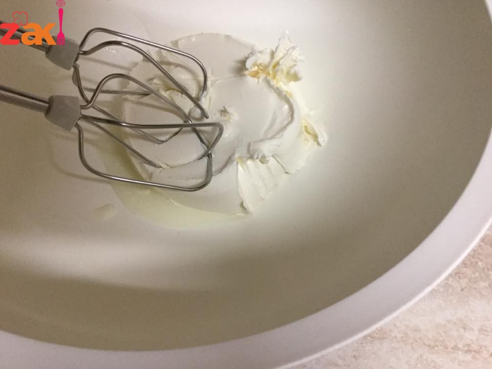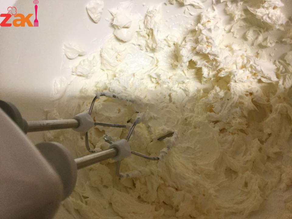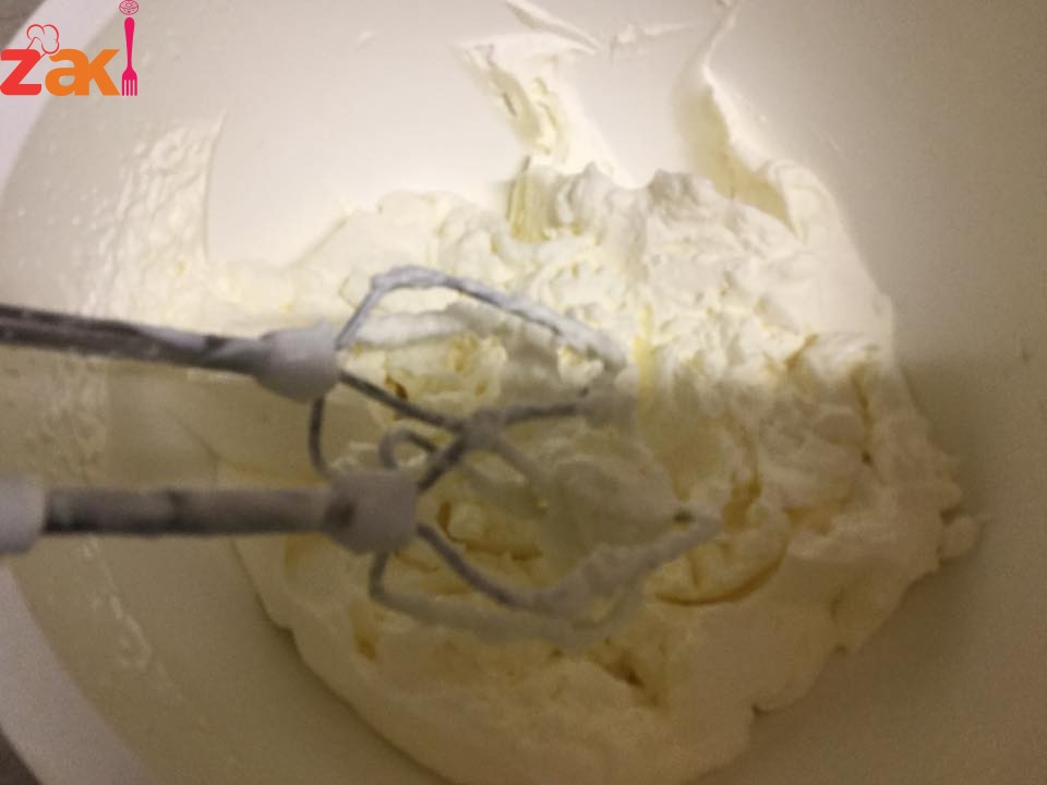 نحضر وعاء عميق ونضع الجبنة الماسكربونة ونخفقها قليلاً ثم نضع عليها الشوكولا البيضاء الذائبة نخفق الكريمة الباردة جداً مع ربع كوب من السكر